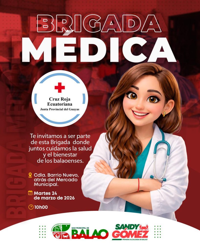 En articulación con la Cruz Roja Ecuatoriana, te invitamos a ser parte de nuestra Brigada Médica, Seguimos trabajando por el bienestar de los balaoenses, acercando atención médica gratuita y oportuna a quienes más lo necesitan 🙌