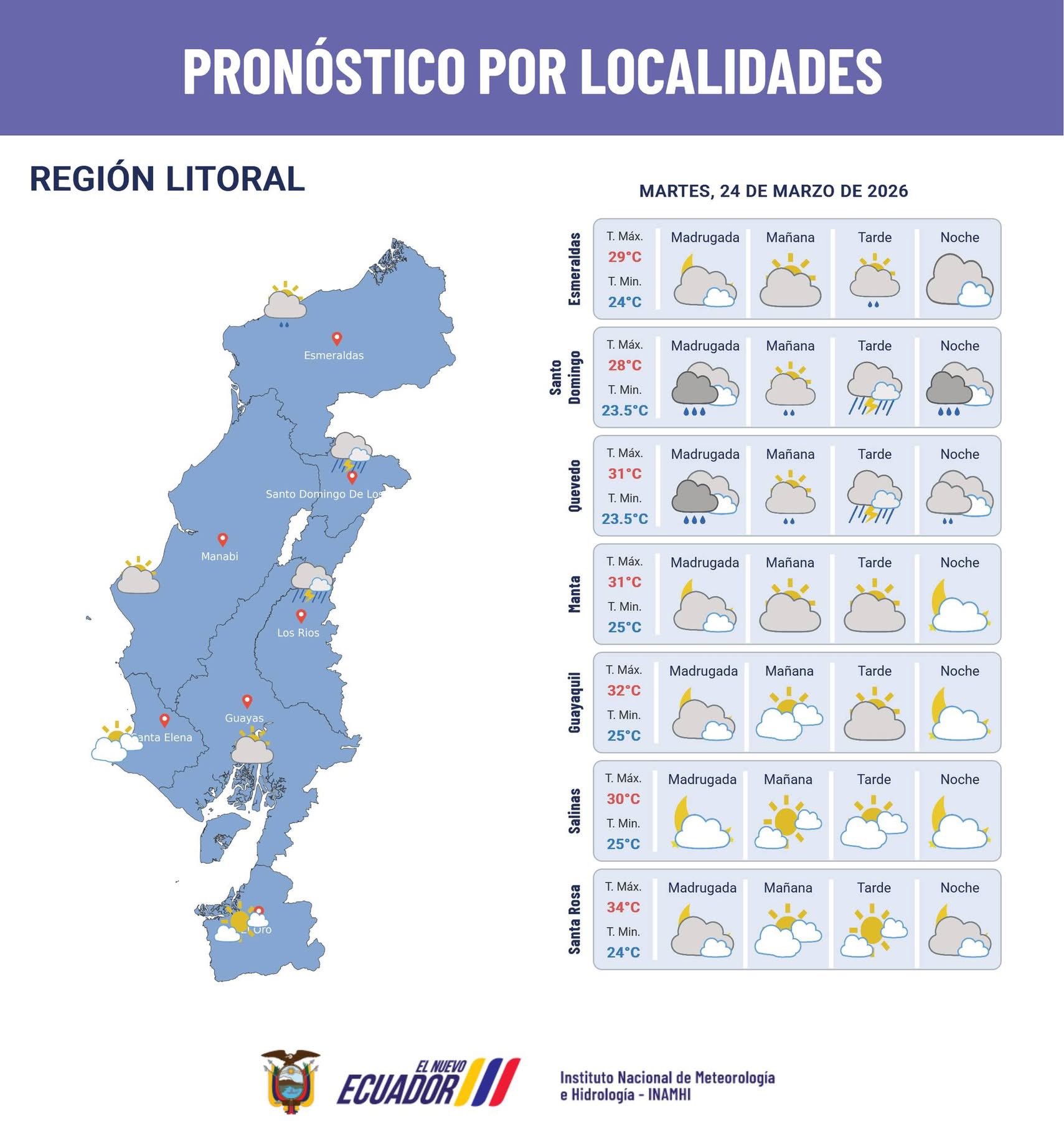 Temperaturas entre 24°C y 34°C en el Litoral, con cielo parcialmente nublado y lluvias en la tarde/noche.