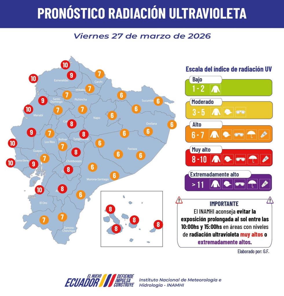 Radiación UV entre alta y muy alta (6–10) en gran parte del país.